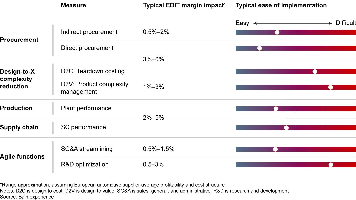 The most effective programs address purchasing, labor costs, financing costs, supplier selection and management, product complexity, design-to-cost decisions, and supply-chain operations. They also cut down sales, general, and administrative (SG&A) costs, and redesign the manufacturing footprint to remove excess capacity, which reduces the fixed cost base and improves flexibility in the face of volume uncertainty.