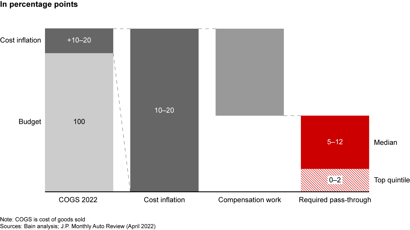 Our research shows that a fifth of suppliers are able to recover around 70% of their additional costs from inflation, while the majority achieve lower cost pass-through levels of 40%–50%. The most successful companies have been able to realize price increases in the low double digits in 2022.