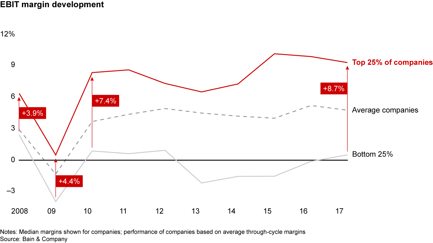 Suppliers who proactively restructure their business and take far-reaching action to reset costs during periods of disruption have a unique opportunity to improve their performance and distance themselves from competitors. Our research into the performance of suppliers during the 2008–09 financial crisis shows companies made dramatic gains and losses during and after the downturn. Those with a high level of agility in cost restructuring massively outperformed their competitors when the economy bounced back (see Figure 3).