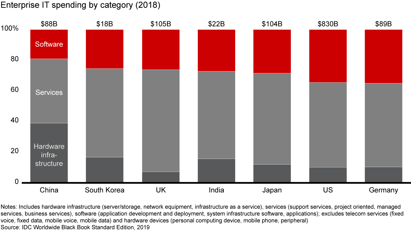 - Because China’s businesses spend far less on software, China has an underdeveloped ecosystem of software architects, developers and administrators. One way to measure this is by the mix of spending across hardware, software and services (see Figure 2). Every dollar spent on hardware infrastructure in the US supports more than three dollars of software spending, while a dollar spent on hardware in China generates only about 50 cents worth of software spending.