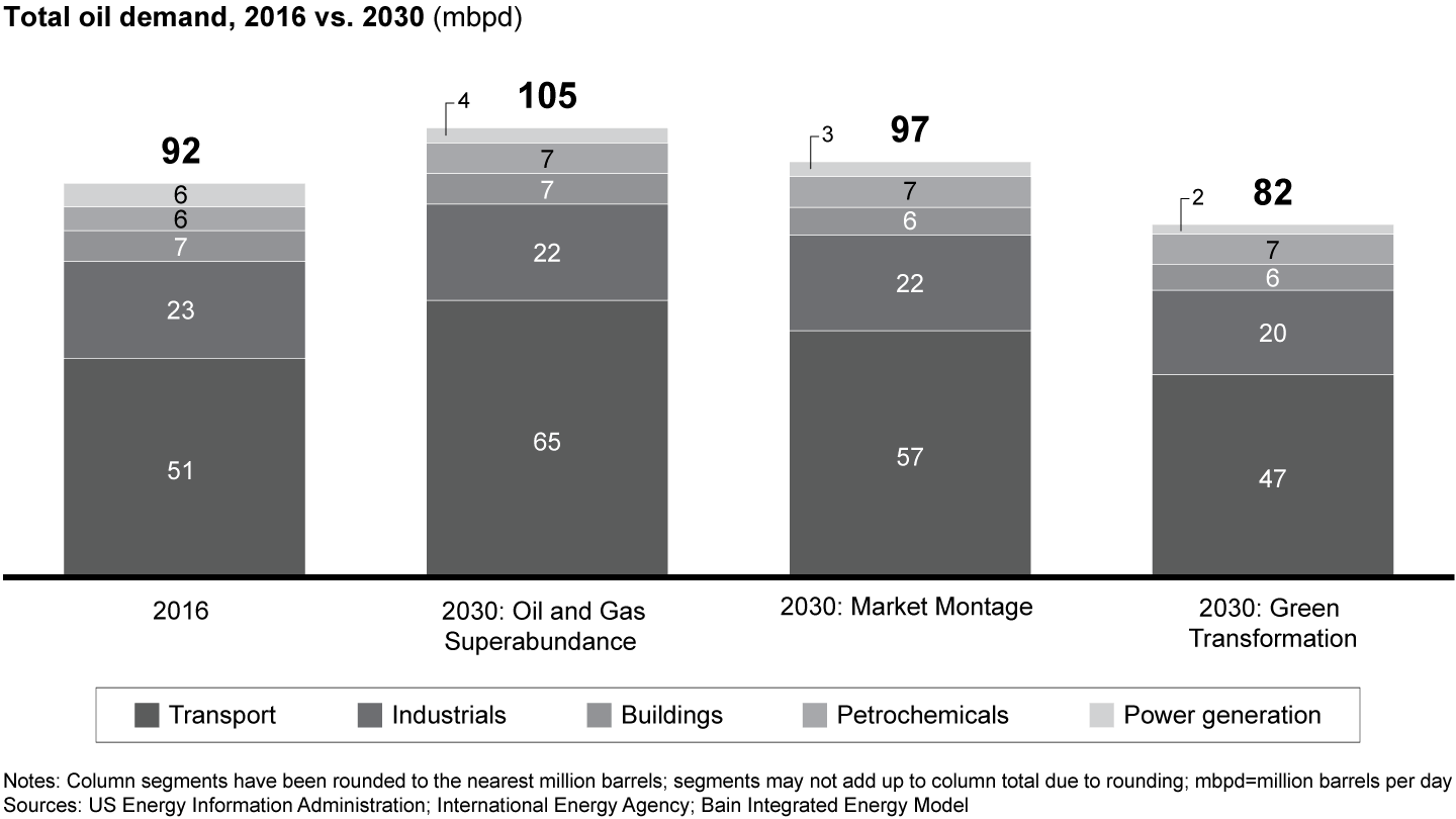 Refiners need a clear strategy to navigate the energy transition, one that prepares them for market shifts caused by these changes. Bain’s recent research on integrated energy markets analyzed ways that several sources of disruption—including the geopolitics of the global oil supply, competition from renewables and associated technologies, attitudes toward carbon policy, and changes in mobility—could influence total demand for oil and gas by 2030. (For more, see the Bain Brief “Managing the Energy Transition: Three Scenarios for Planning.”) Based on this research, we defined three supply-and-demand scenarios: Oil and Gas Superabundance, Market Montage and Green Transformation. Several interesting patterns emerged (see Figure 1):