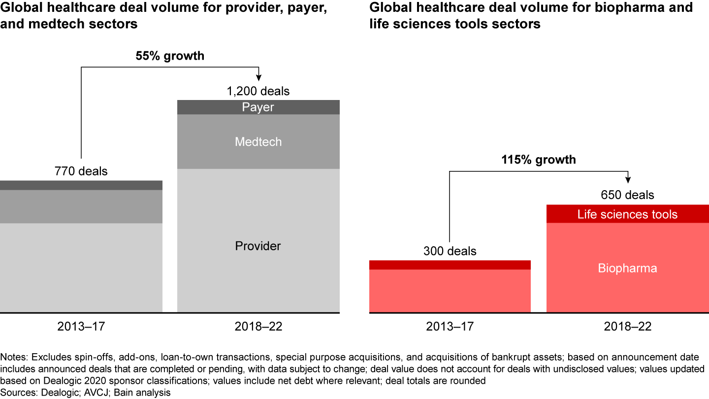 - Biopharma and life sciences tools are attractive: Within these two subsectors, more than 600 healthcare buyout deals have been executed over the past five years globally, fueled by strong end-market growth tailwinds, recession resistance, and attractive returns for private equity. Given that these trends are expected to continue, executing coherent deal strategy in biopharma and life sciences tools has become a must-have for US/EU funds.