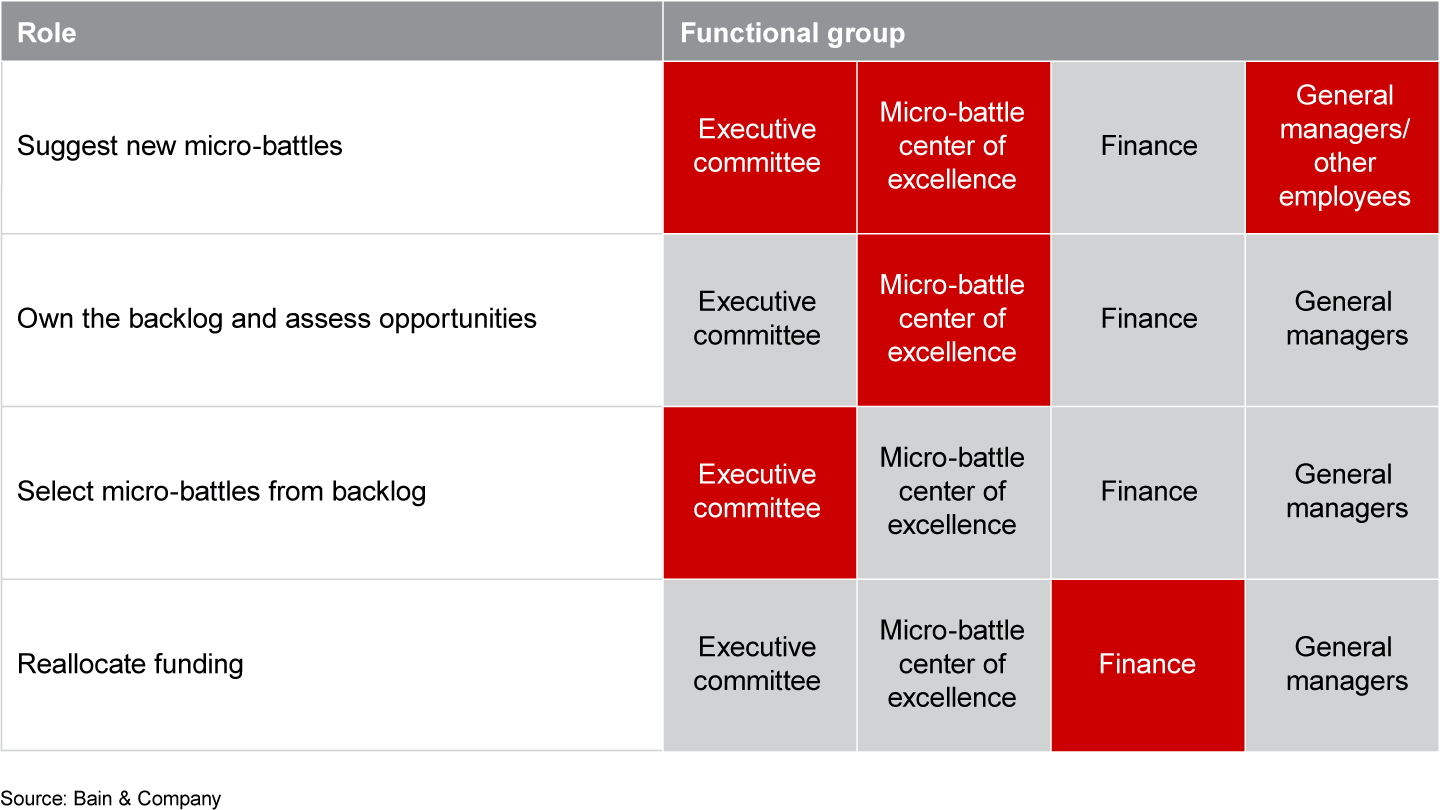 Some organizations manage micro-battles by identifying the functional groups that are best suited to perform specific roles