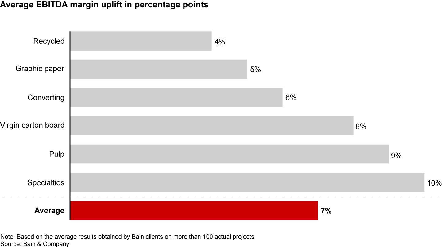 Finally, world-class mills are highly adaptable so that they can be optimized and tailored to each company’s specific goals. When done right, achieving true operational excellence can lead to great value generation. Bain has supported many paper and packaging companies in a broad cost savings program across more than 70 plants, resulting in an average 7-percentage-point EBITDA increase (see Figure 2).