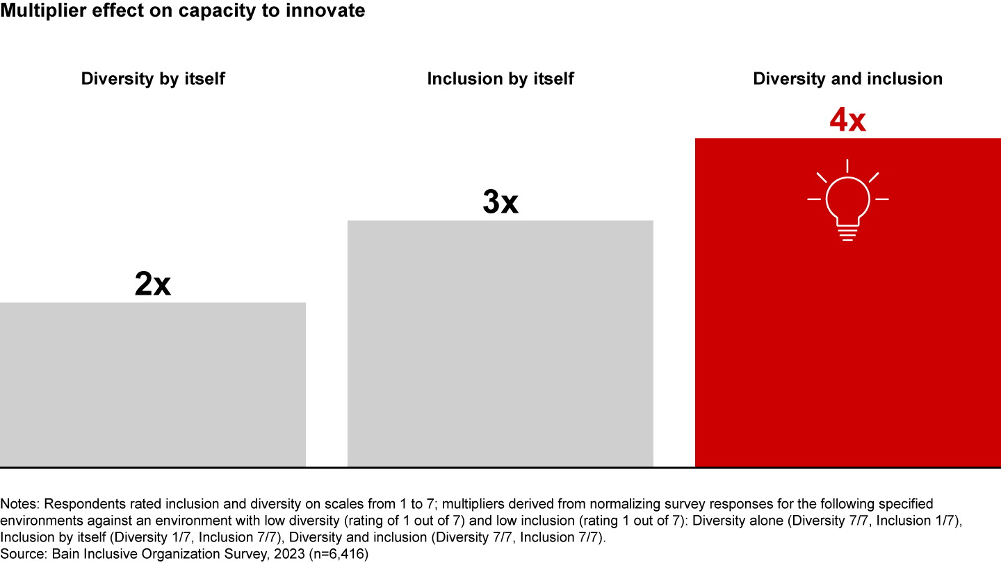 It is worth noting that diversity and inclusion are separate (though interrelated) factors in boosting team performance. For example, many studies have shown that more diverse teams generate more innovative ideas, and our research corroborates this: Having teams that are highly diverse increases an organization’s capacity for innovation twofold. Teams that are highly inclusive without being diverse increase innovative capacity threefold, and the multiplier rises to four with teams that are both diverse and inclusive (see Figure 2).