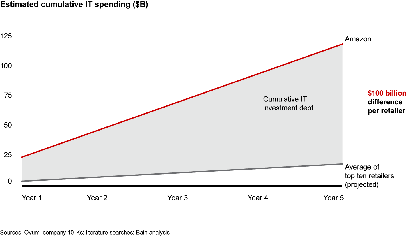 That’s no small challenge. For instance, the world’s 10 largest traditional retailers are spending a much smaller proportion of their revenues on IT than Amazon, which views digital tools, data analytics and other technology as core to its mission to get ever closer to customers. The cumulative impact of this underspending—call it their “IT investment debt”—is likely to be striking. On average, each of those top 10 retailers will be putting an estimated $100 billion less into IT than Amazon over the next five years at current spending rates, according to Bain & Company research (see Figure 1).