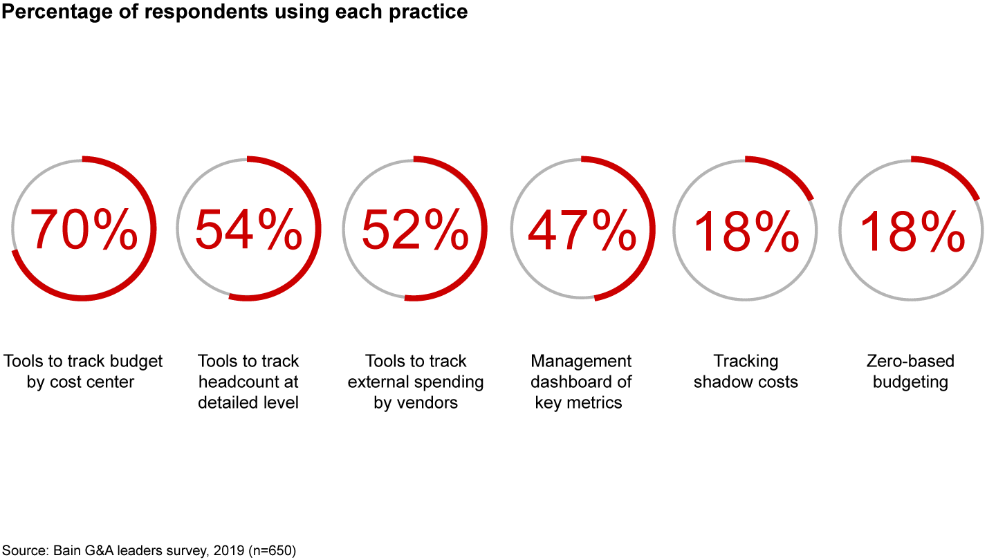This imperative might sound obvious. However, many support functions don’t manage costs with the same rigor that sales, manufacturing and operations costs are managed. For example, only 54% of survey respondents track functional headcount in detail, and only 47% have management dashboards to measure and track efficiency and effectiveness. Worse, many companies don’t have a complete view of support-function costs. Only 18% of survey respondents said their companies track shadow costs, namely, people in distributed business units performing activities that duplicate those performed by the support functions (see Figure 5).