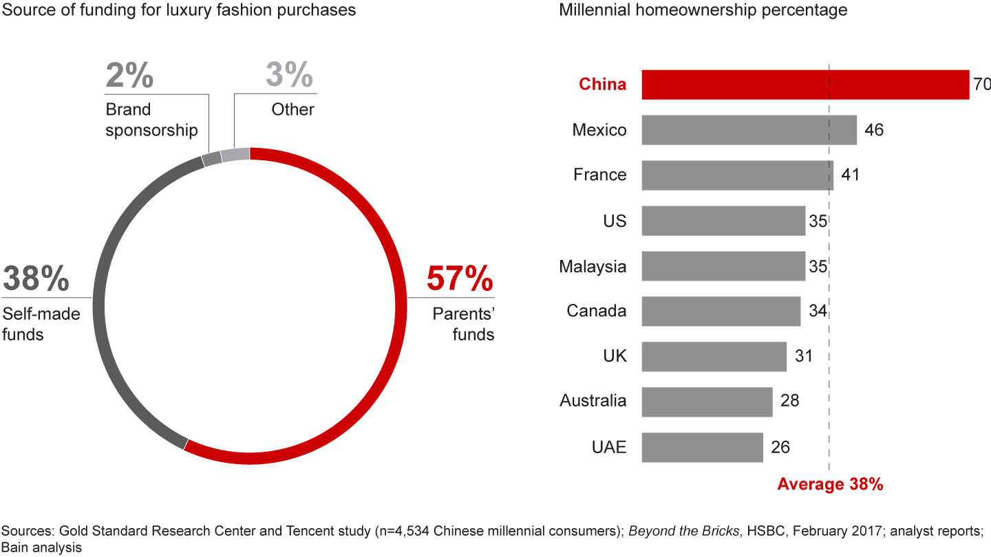 Consumers aged 23 to 38 are willing to spend on luxury brands, and financially able to do so. Fully 70% of China’s millennials own their own homes—twice the rate of US millennials, according to HSBC’s Beyond the Bricks study (see Figure 4). And they can get funding from their parents if they want to buy luxury goods. Moreover, these young consumers are well informed about luxury and eager to embrace innovative trends, such as the convergence of high fashion and sportswear. Millennials are the big market for luxury sportswear products like Balenciaga’s Triple S sneaker, which was introduced in 2017 and maintained its popularity throughout 2018, and accessories cocreated by Louis Vuitton and Supreme, a fashion brand with roots in skateboarding.