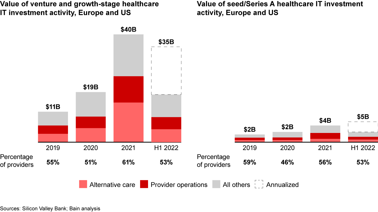 Provider technology funding has been especially active, comprising more than half of deal value from 2019 to 2021 and during the first half of 2022. Provider technology is also a key area in early-stage deals, making up more than 50% of seed/Series A rounds. Most provider technologies receiving funding coalesce around alternative care and provider operations, with later-stage venture activity skewing toward alternative care as a robust funding environment brought an explosion of digital health activity and early-stage provider IT funding slanting toward provider operations solutions.