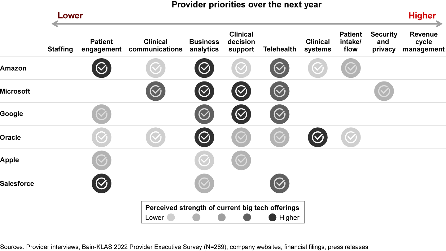 Big tech’s current positioning lags market leaders in many of providers’ top strategic priorities for this next year