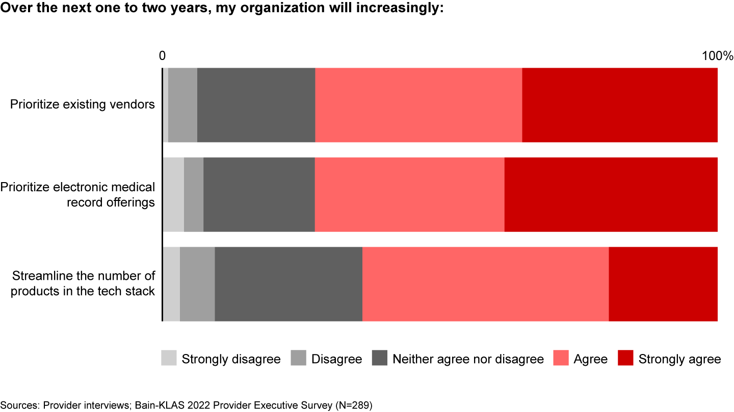 - Providers are increasingly streamlining bloated tech stacks and looking to their electronic medical records (EMR) providers and other existing vendors for new solutions before evaluating new vendor offerings.