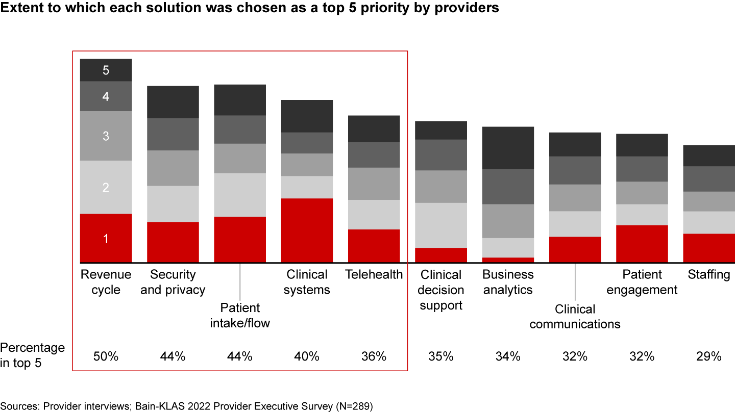 Providers cite revenue cycle management (RCM), security and privacy, patient intake/flow, clinical systems, and telehealth as the most strategically important categories for software investment over the next year (see Figure 4).