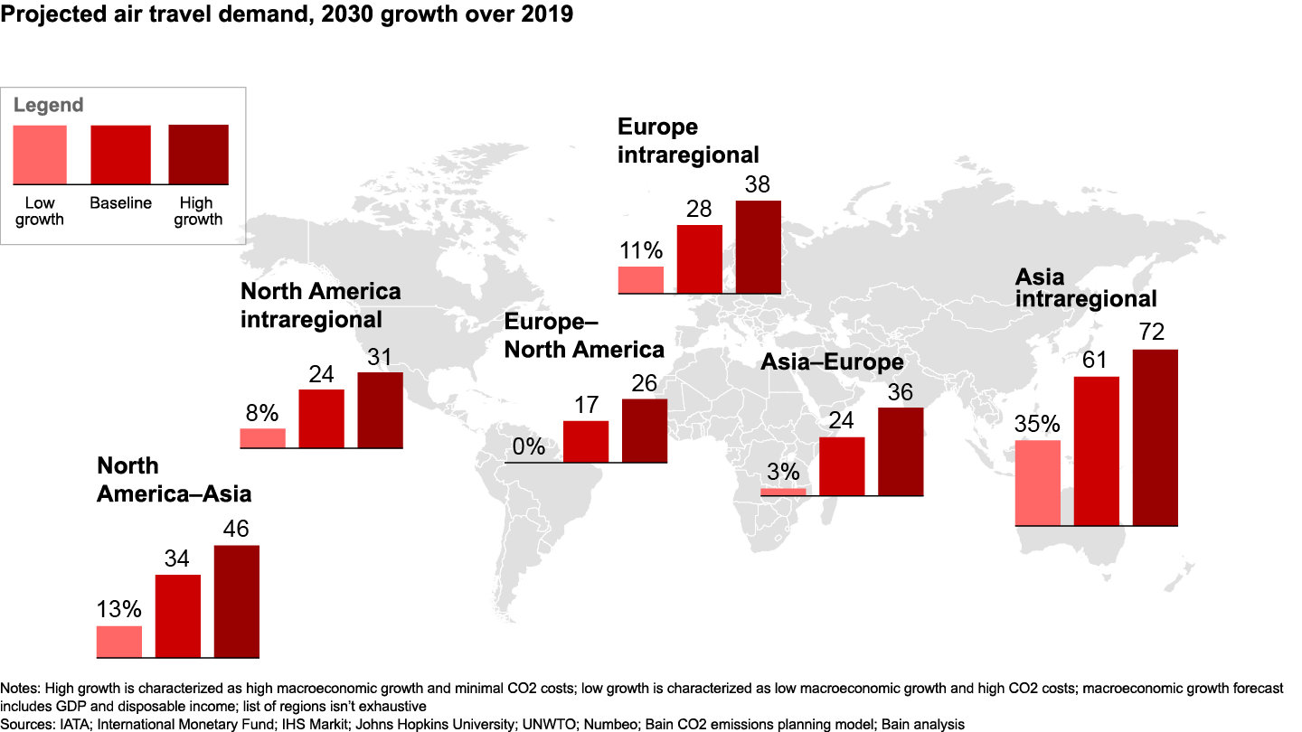 - Regional trends remain dynamic (see Figures 2 and 3). We anticipate Asia will continue to fuel global demand growth, with intraregional traffic forecasted to increase by 131% from 2019 to 2040. Continuing its strong trajectory postpandemic, China is expected to remain one of the fastest-growing markets; our model forecasts that China’s overall air traffic in 2040 will be more than double the 2019 level.