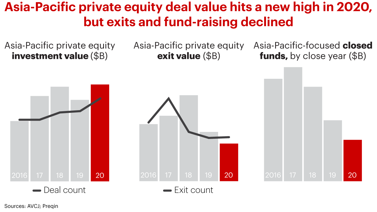 When Covid-19 shut down businesses across the Asia-Pacific region in early 2020, stunned private equity investors retreated from the market, but not for long. By the second quarter, many were back closing deals—especially in China, India and Japan—pushing deal value to a record $185 billion by year-end. Returns were steady, but recession and market turmoil depressed exits and fund-raising. Exit value fell 24% year-on-year to $70 billion, and fund-raising declined 32% to $90 billion.