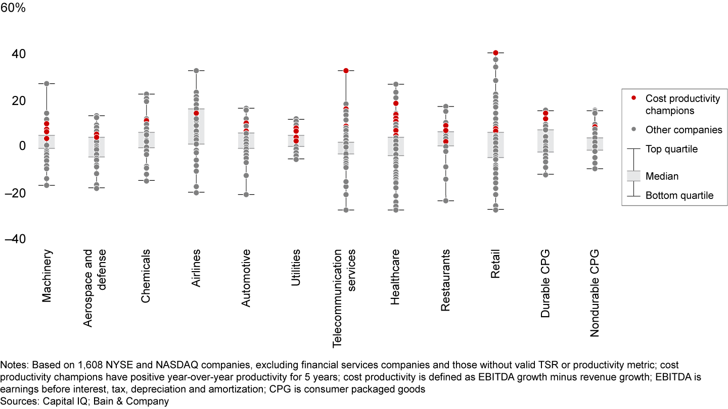 To understand what it takes to bend the cost curve, Bain & Company analyzed the cost productivity of 1,574 public companies across industries. To keep the analysis simple, we defined cost productivity as EBITDA growth less revenue growth—the part of EBITDA growth attributable to cost rather than revenue. To be clear, this metric is not perfect in isolating cost issues from pricing or product mix issues, nor does it not replace other standard metrics, such as cost of goods sold or return on capital employed.