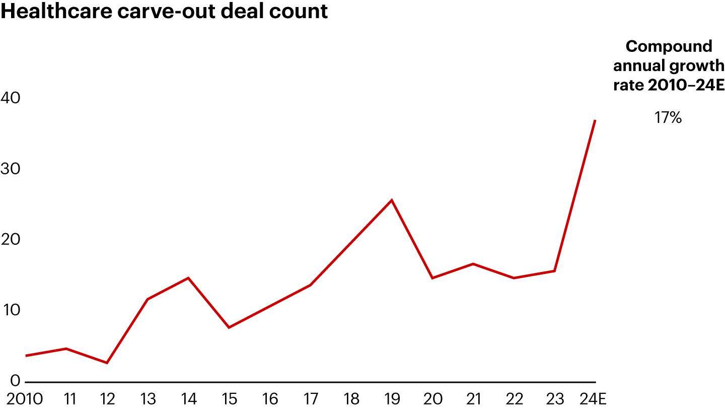 • Healthcare carve-outs rose in 2024, as public healthcare companies sought to improve shareholder returns and private equity (PE) firms remained hungry for assets.