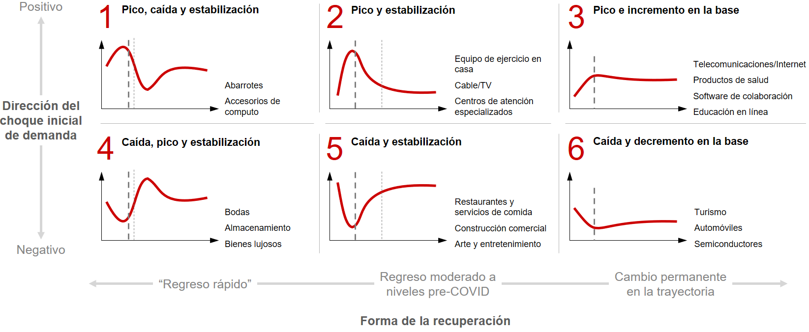 Figura 3: Las curvas del restablecimiento de la demanda variarán por industria y geografía, pero generalmente seguirán uno de seis arquetipos