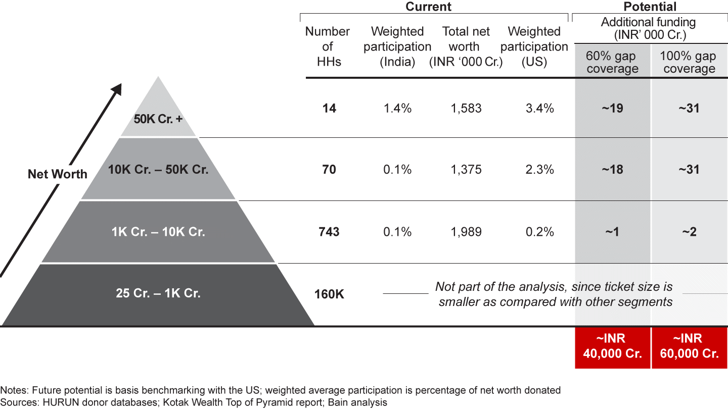 A benchmarking exercise of weighted average participation (the percentage of net worth contributed per year) compared with the US suggests an additional strategic giving potential of INR 40,000 to 60,000 crore from large UHNI donors alone. This increase, when compared with their current contribution of an estimated INR 23,000 crore, indicates a potential increase of 2.5 to 3.5 times the current level of giving (see Figure 11).