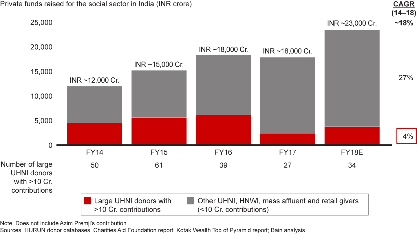Individual philanthropists: Individual philanthropists accounted for about 60% of total private funding in FY2018 in India, compared with individual and bequest contributions of approximately 80% of the US’s total private funding in 2017, according to Giving USA. Clearly, there is room for growth.