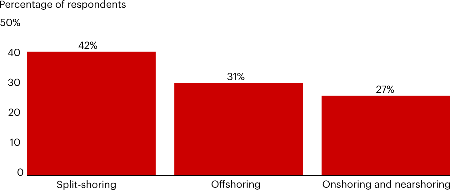 Garantizar la continuidad del suministro es la principal razón para cambiar la ubicación de la base de proveedores, seguida por la reducción de costos laborales (ver Figura 1). Más de dos tercios de las empresas están invirtiendo en cadenas de suministro más cercanas, ya sea mediante split-shoring, onshoring o nearshoring (ver Figura 2).