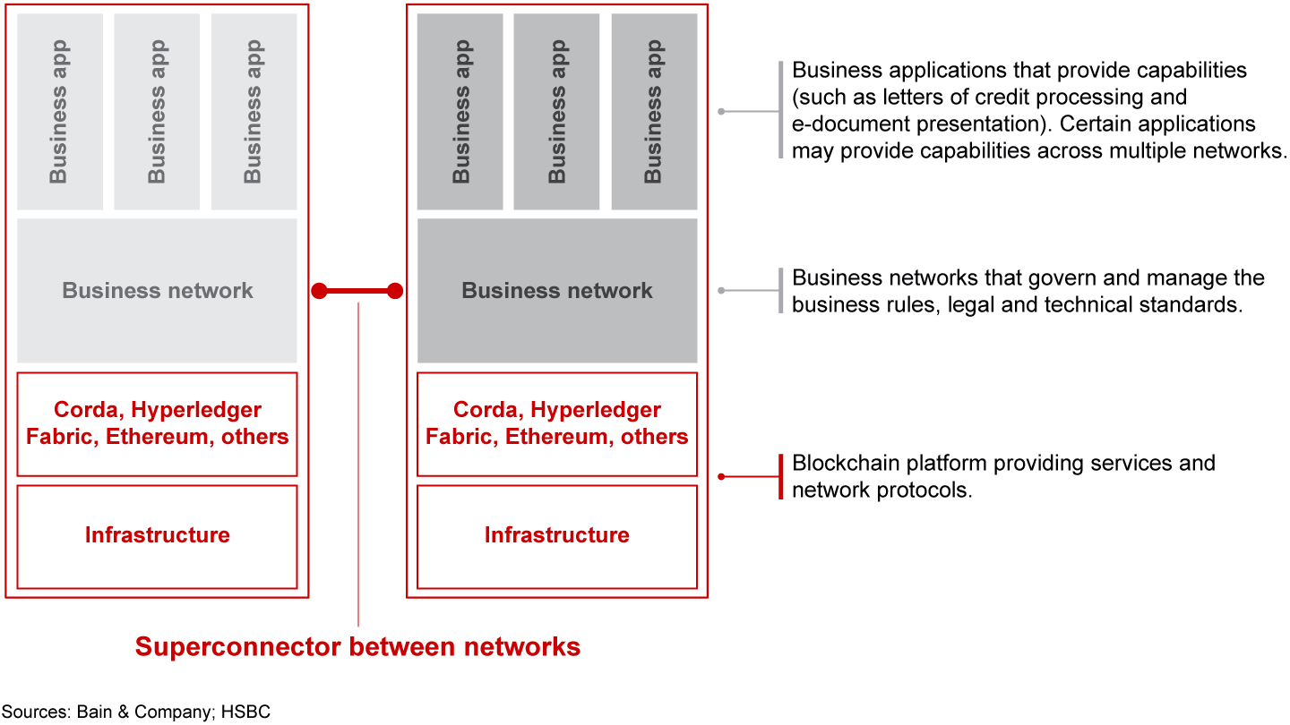 Grow fast. While one global trade network might be ideal, it is not likely to materialize, at least in the medium term. The more likely outcome is a network of networks, some for mainly banks, some for shippers, some serving individual industries or countries (see the sidebar “What trade finance networks will look like”). Each of those individual networks will need sufficient scale and market participation in order to create value. And different networks may have different rules and shared data, so it will be difficult for them to connect together. While it will be much easier if they use the same underlying platform, rather than different technologies, we also see the need for other types of network interoperability.