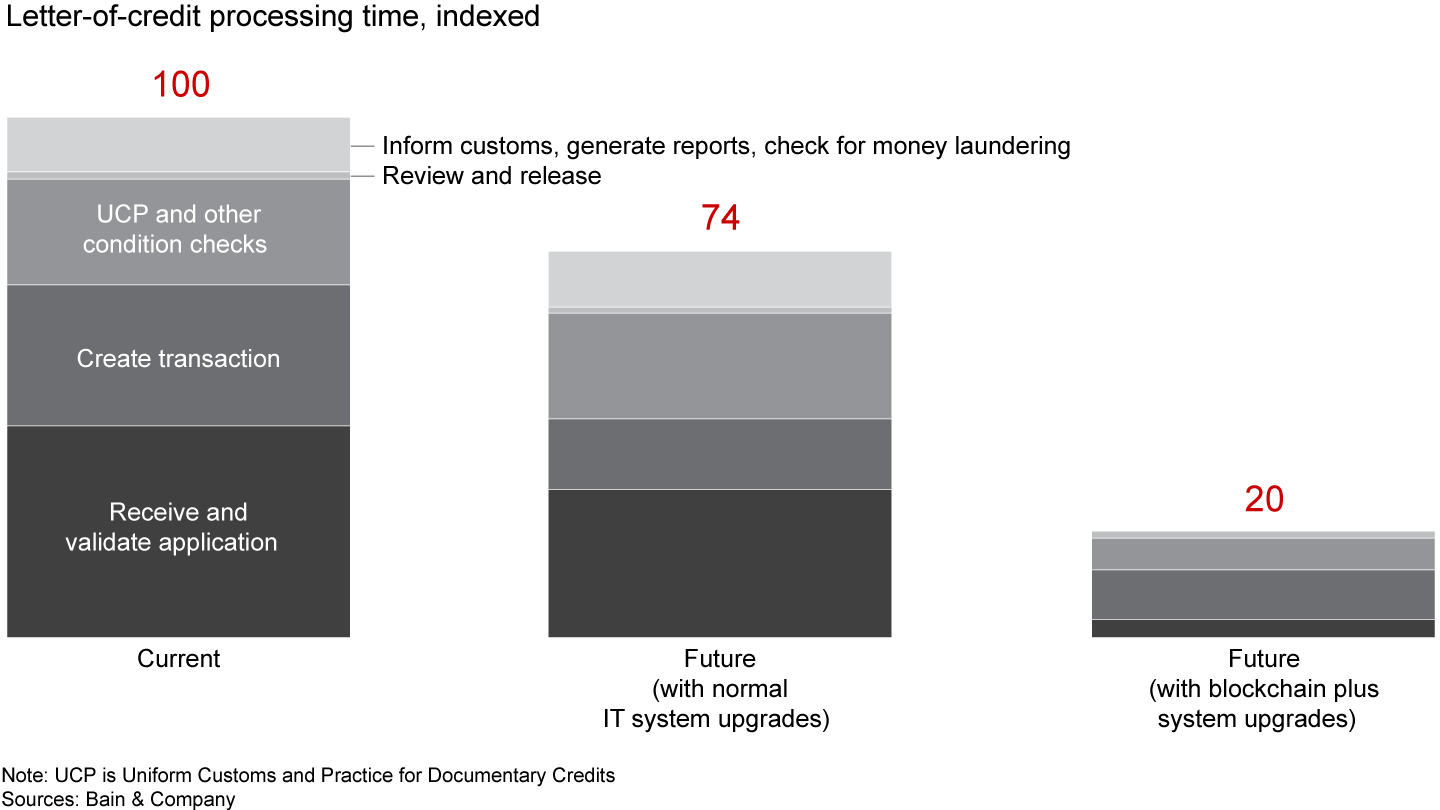 Letters of credit, also known as documentary credits, are among the most popular instruments in international trade. They represent a written liability in which a bank, on behalf of a buyer, assures a seller the payment will be made according to the agreement in place. The added risk mitigation can stimulate more trade, especially if improvements underpinned by blockchain make the products more attractive. Bain & Company estimates that blockchain could increase global trade volumes by $1.1 trillion by 2026, from the current base of $16 trillion.
