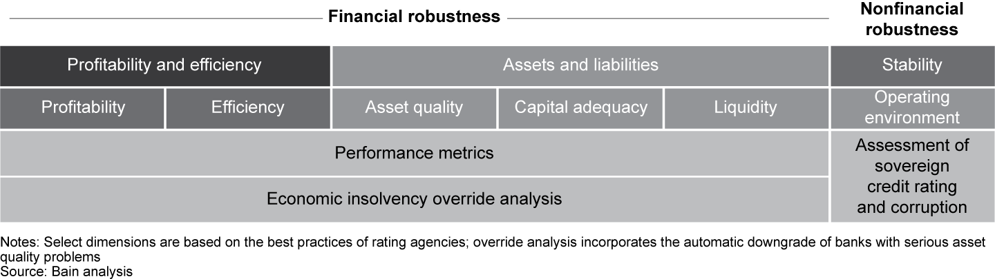 The scoring model in Bain’s health check of the banking system gathers data in six areas, with the heaviest weighting on asset quality (see figure below).