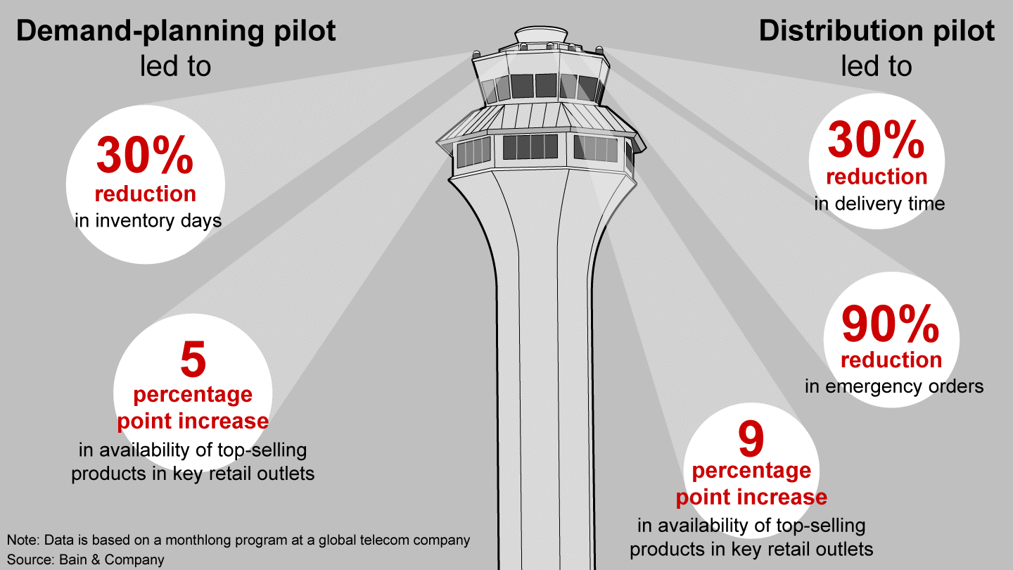 Though building a control tower takes time, well-designed roadmaps can deliver surprisingly quick gains. A global leader in wireless telecommunications designed an interim control tower focused on product portfolio and inventory management. It launched one pilot program to increase the availability of devices in retail outlets, and another to improve inventory management of more than 3,000 stock-keeping units. After one month, the demand-planning pilot had reduced inventory days by 30% and increased the availability of the firm’s top devices in better-performing retail shops by 5 percentage points. The distribution pilot reduced point-of-sale delivery time by 50%, slashed emergency orders by 90% and increased the availability of top products in retail shops by 9 percentage points (see Figure 1). Building on these successful first steps, the leadership team selected a provider for a long-term control tower solution.