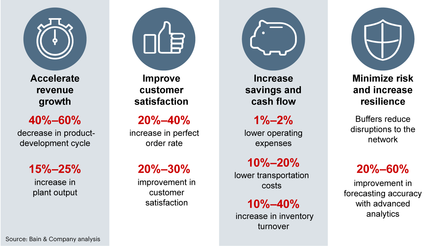 - Investments in supply chain resilience can deliver a 15% to 25% improvement in plant output and a 20% to 30% rise in customer satisfaction, Bain’s experience shows.