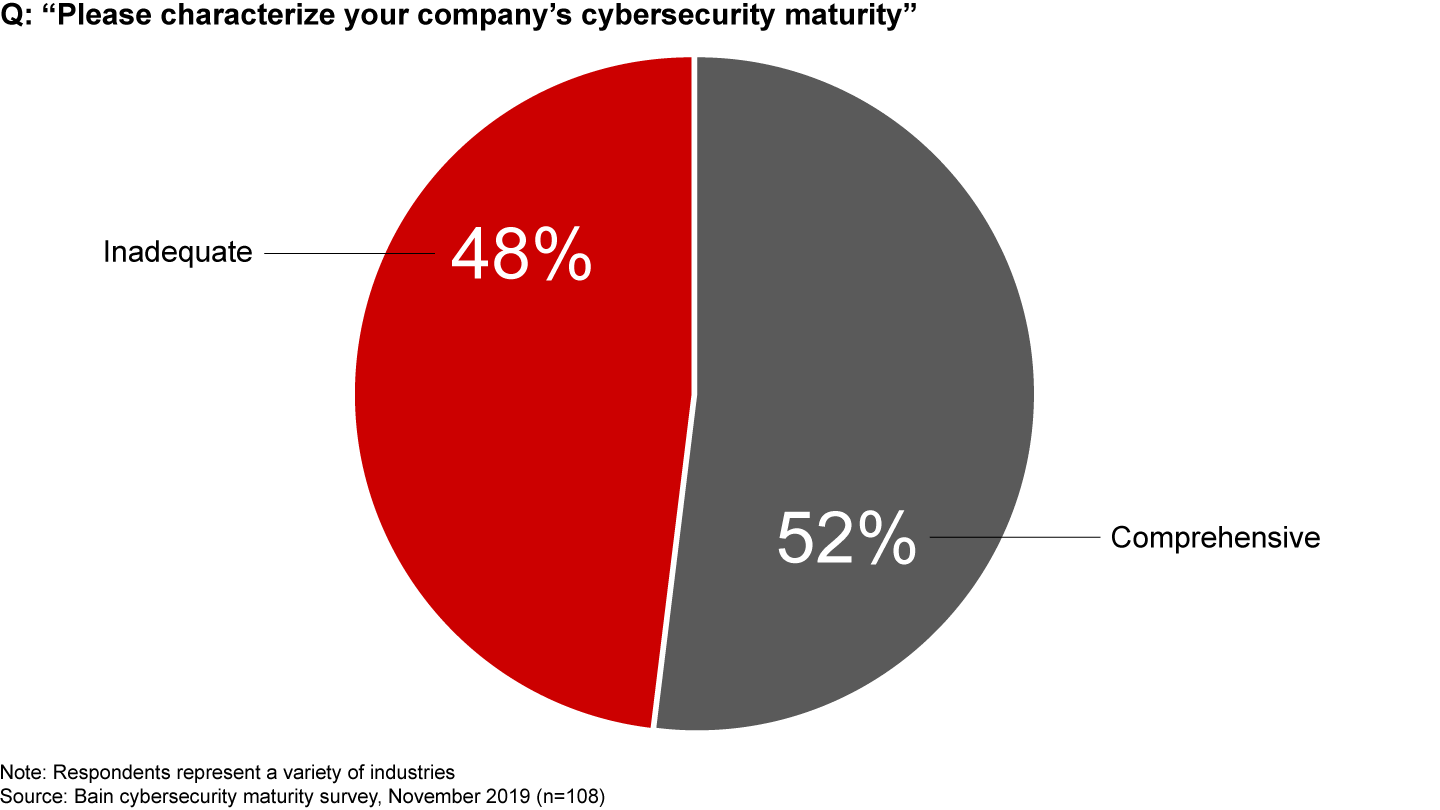 Hackers recognize these weaknesses and aggressively exploit the situation. Businesses are also aware they need to strengthen their cybersecurity. In November, well before the Covid-19 outbreak, 48% of executives in a multi-industry survey conducted by Bain reported their company’s cyberdefenses were inadequate (see Figure 2).