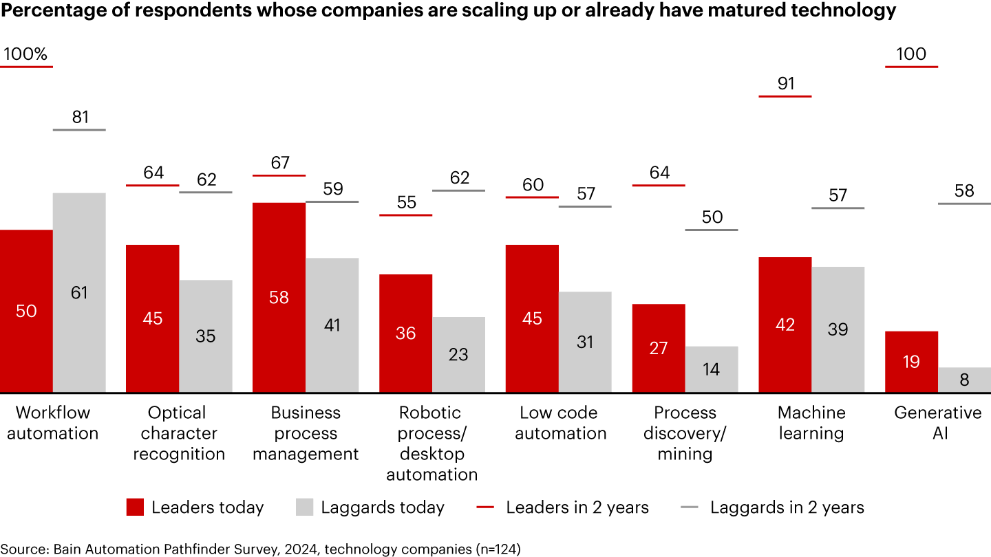 Bain’s latest survey of 893 automation executives worldwide, including 124 in technology companies, finds that companies investing most heavily in automation outperform laggards in savings achieved and adoption of new, more disruptive technologies. (We define leaders as companies investing at least 20% of their IT budget in automation in the past two years, and this elite group achieved an average 22% in cost savings. Laggards are companies investing less than 5% of their IT budget in automation, and these firms achieved just under 8% in savings on average.)