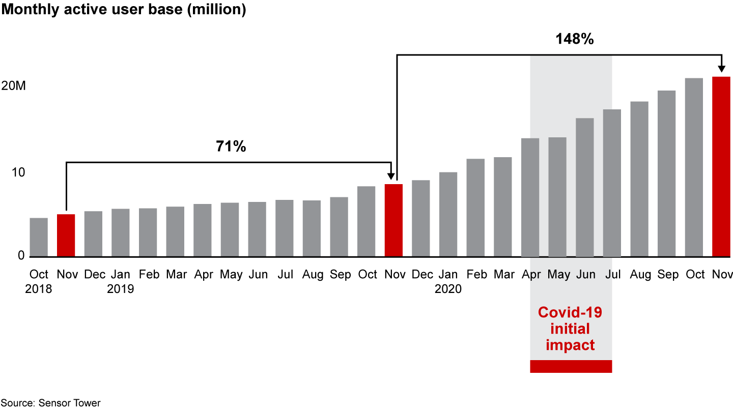 Demand for Unacademy’s services were strong prior to Covid-19. When it was launched, Unacademy filled a critical gap: The traditional market for test preparation and coaching suffered from inconsistent quality and limited access outside of major cities. But the pandemic put Unacademy’s growth into overdrive. The platform’s MAU in November 2020 was up 148% year-on-year, more than double the previous year’s average growth of 71% (see Figure 27).