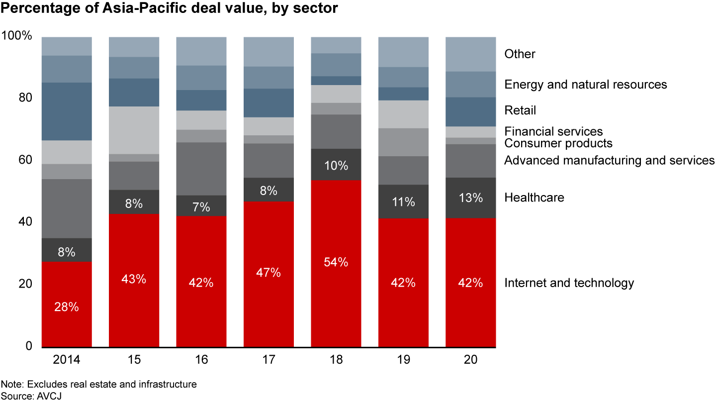 Amid the many disruptions and challenges industries faced in 2020, growth powered ahead almost unperturbed in one sector: digital businesses. Private equity investment in Asia-Pacific’s Internet and technology sector already was booming before Covid-19 hit, with the fastest growth in deal value among all industries for five years in a row. But economic lockdowns prompted by the pandemic gave an unprecedented boost to many digital businesses and platforms, heightening investor interest. As governments directed millions of people to work from home or stay at home, consumers began purchasing almost everything online, triggering a surge in online sales. And the extended lockdowns have set the stage for some profound long-term changes in consumer behavior.