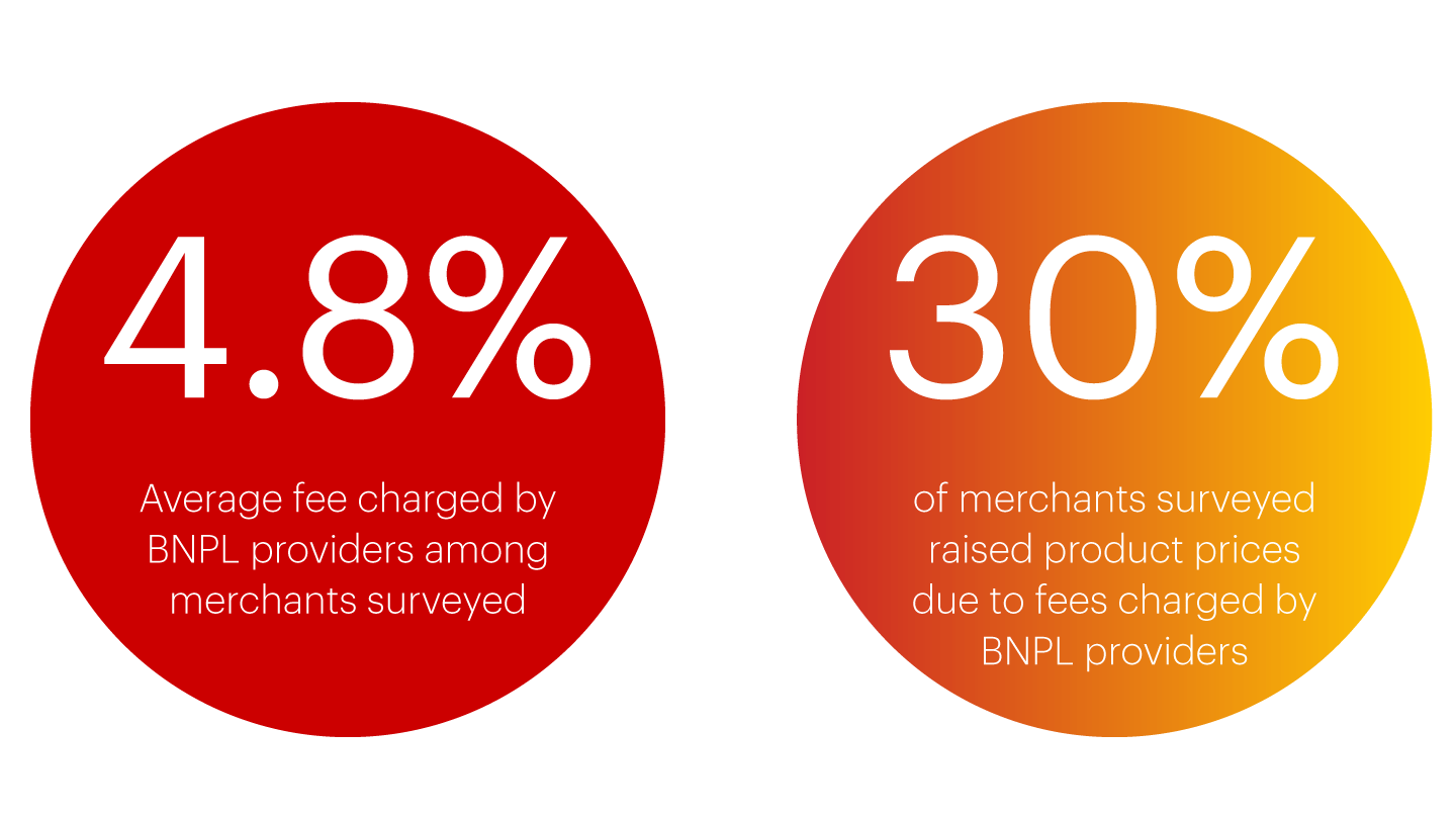Every merchant has a cost to accept payments. On average, fees that smaller merchants incur for accepting Visa or Mastercard payments are around 1.5%. Fees charged by BNPL providers average 4.84% as reported by the merchants we surveyed, more than three times higher. However, with more than 90% of these merchants experiencing on average three of the benefits described above, it’s easy to see how the 3.3 percentage point difference can be made up.