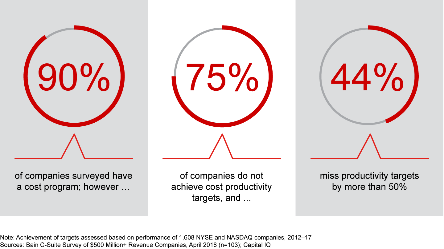 Yet improving cost productivity year after year is not easy. In fact, while some 90% of companies Bain surveyed recently have a cost program, 75% do not achieve their targets. And 44% miss targets by more than 50% (see Figure 4).