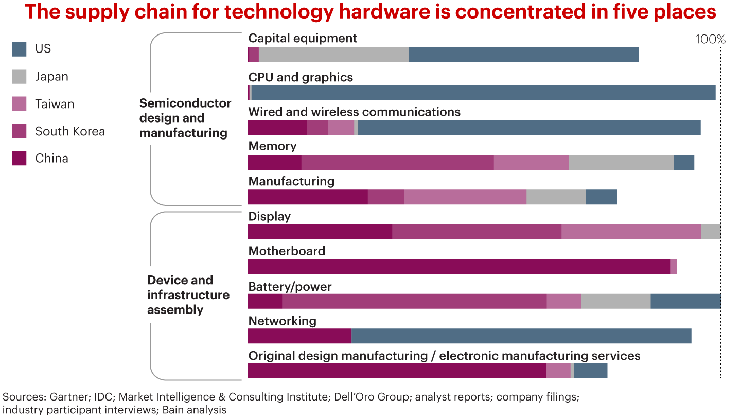 The Covid-19 global pandemic has caused acute disruptions in the technology sector supply chain, highlighting the need for a trend that was already underway: diversifying supply chains to a broader range of locations. Most technology hardware comes from just five places, exposing buyers and sellers to the risks of government actions, such as Malaysia’s broad shutdown of factories, including test and supply plants, during the Covid-19 outbreak. One notable point of tensions is that most semiconductor fabrication plants are in China and Taiwan. Technology companies like Nvidia, Qualcomm and Apple rely on these facilities to produce the most advanced chips. Taiwanese chip maker TSMC announced in May 2020 its plan to build a $12 billion fabrication plant in Arizona—one of many moves across the sector to add redundancy and resiliency to the supply chain.
