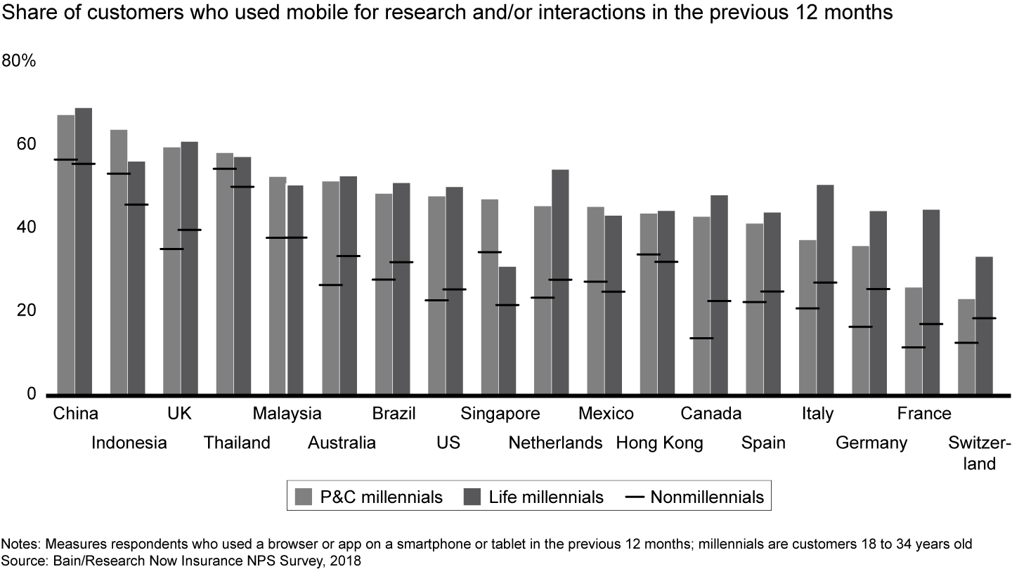 For this report, Bain & Company worked with Research Now SSI, an online data sampling company, to survey 174,003 retail insurance customers in 18 countries. The report was prepared under the leadership of Henrik Naujoks, leader of Bain’s Financial Services practice in Europe, the Middle East and Africa; Tanja Brettel, practice director in the Financial Services practice in EMEA; and Financial Services partners Darci Darnell, Andrew Schwedel and Harshveer Singh. They were supported by Eric Almquist and Gunther Schwarz, who are partners in Bain’s Financial Services practice, and Christy DeGooyer, practice director in the Americas. Team members were Shilpi Gupta, Pranav Singh, Lakshay Kataria, Abhishek Sethi, Sameer Gurijala, Shikhar Sachdeva; Yogendra Patel, Camille Lefebvre, Alix Pany, Gabrielle Jourdain, Ilker Carikcioglu and Entis Sutisna. The authors thank Bain partners in each of the countries covered in the report for their valuable input, and Ron Henkoff for his editorial support.