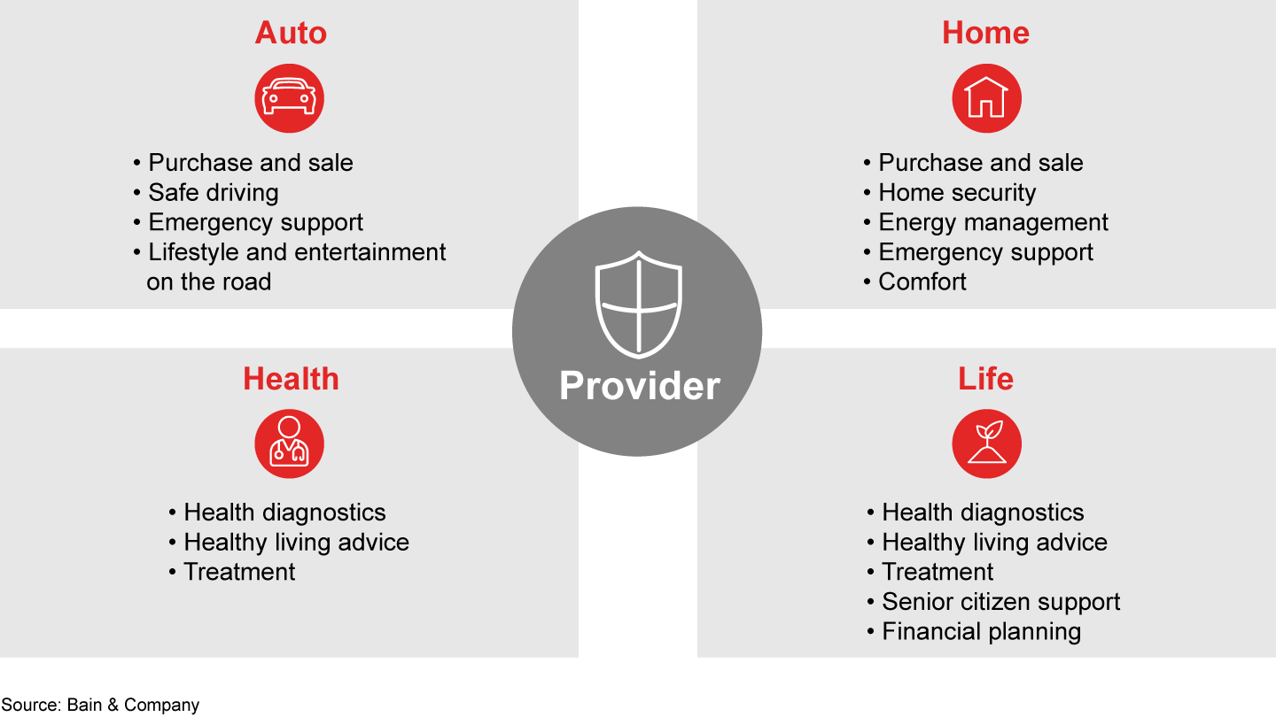 • Auto, home, life and health insurers can reposition themselves at the center of an ecosystem of noncore services, including safe driving programs, home security systems, advice on healthy living and senior citizen support.