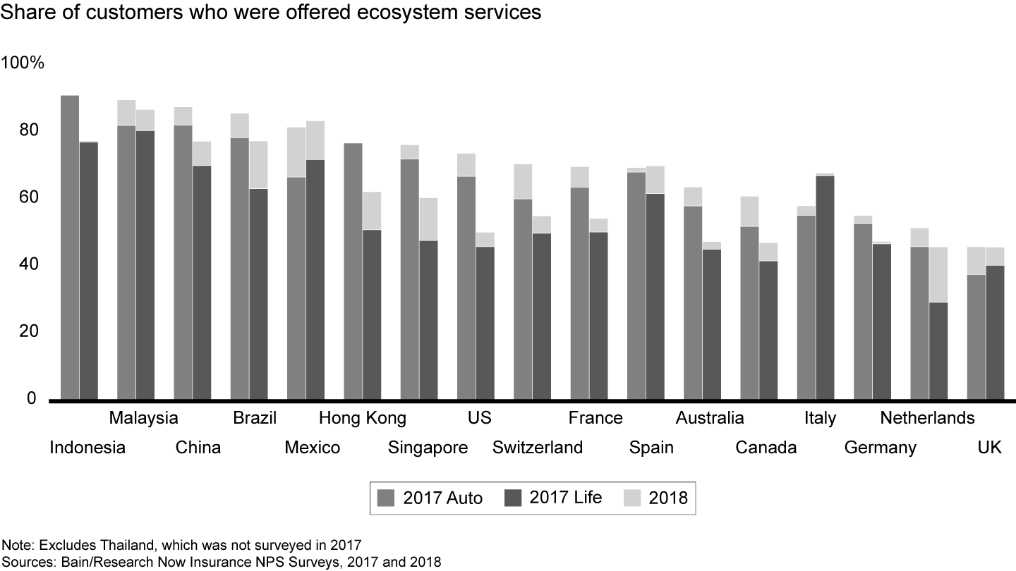 • Across markets, more than 80% of customers are open to an ecosystem of services. In many countries, a majority of customers would prefer insurers to provide these services.