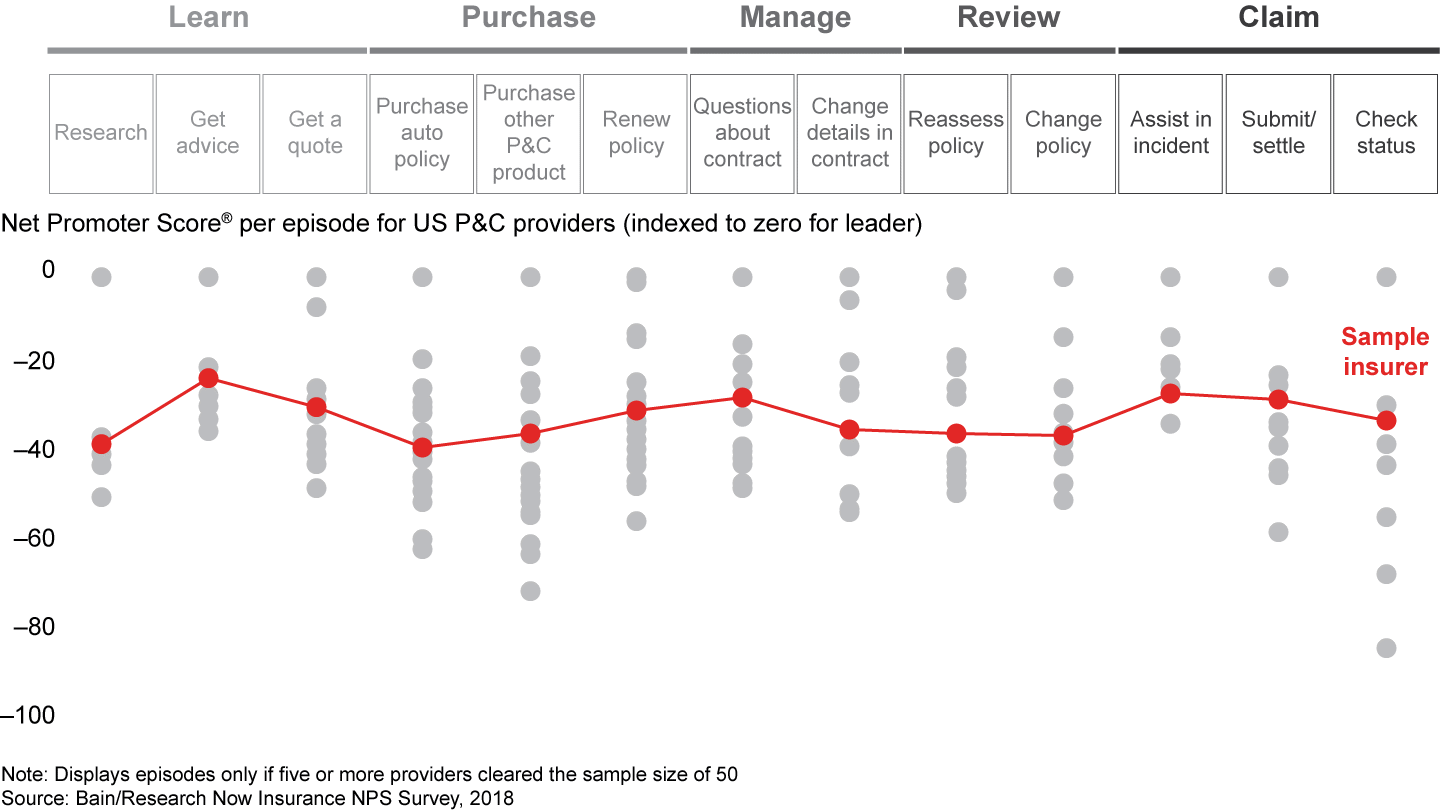 Loyalty leaders delight their customers at the episode level. They understand the importance of pleasing customers at the “moments of truth”—those times when policyholders need support after an incident such as an accident, injury, fire or theft, particularly when they’re ready to file a claim. However, customers don’t report incidents or file claims very often. That means customers frequently judge their carriers on seemingly less consequential episodes such as a request to change a billing address or a question about coverage. Loyalty leaders know that one bad experience, even during a routine interaction, can have serious ramifications. They work hard to constantly improve the customer experience for all episodes.