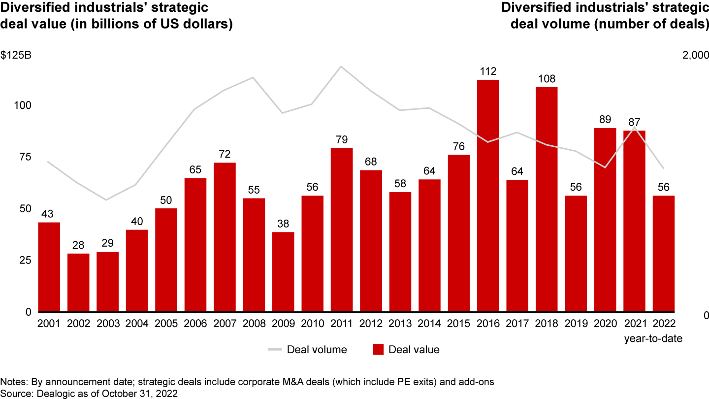 - Diversified industrials’ overall strategic M&A value and volume declined in 2022.
