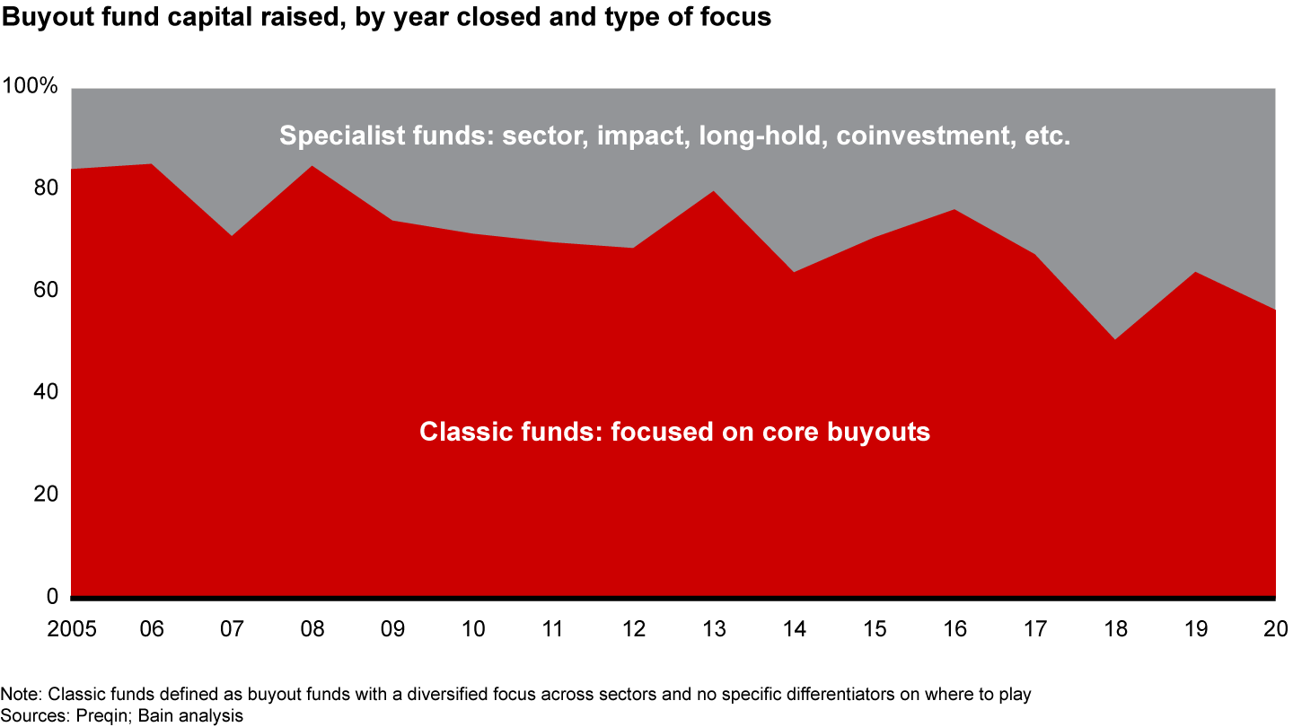 - Once the private equity industry standard, classic buyout funds are ceding ground to specialists.