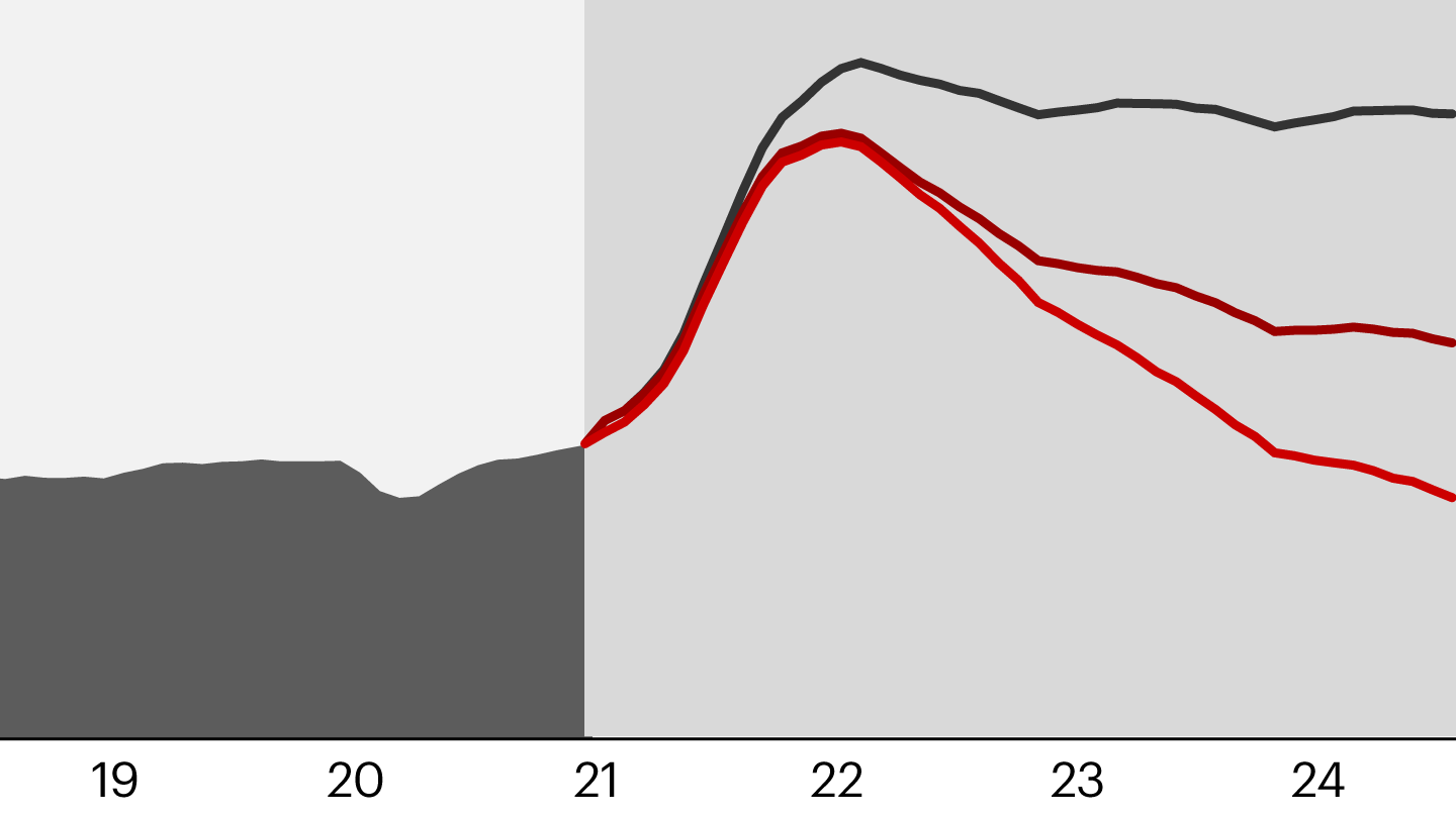 - Return to baseline. As the Covid-19 disruption subsides, elective activity returns to and remains at pre-pandemic levels. The waiting list peaks at well over 10 million. NHS systems have no way to get a grip on the need, as activity in recent years has continuously lagged demand.