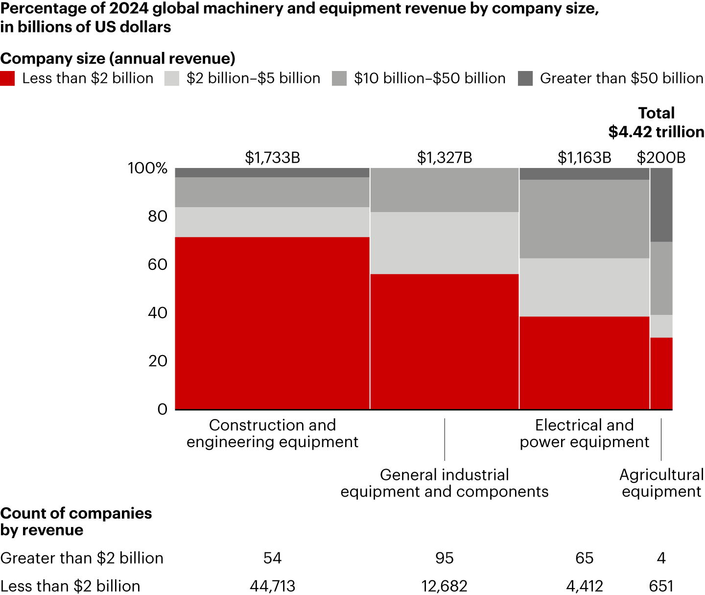 It's surprising, then, that relatively few have turned to M&A to address these concerns. Inactive company leaders cite unattractive valuations, the higher cost of capital, and other common reasons for shying away from deals. But there are even more compelling reasons to move. There’s abundant opportunity to create value through synergies in machinery and equipment. In fact, few industries are as in need of consolidation, with more than half of its global revenue coming from small and midsize companies (see Figure 1). And for building and equipment companies looking to reshape portfolios by divesting assets, private equity has stepped up to buy.