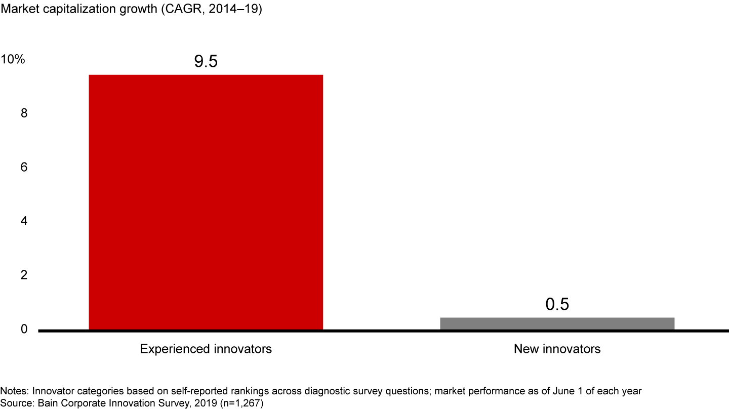 Exploration can be difficult and uncomfortable, but the payoff is well worth the challenge, Bain & Company research has found. Working with Dynata, a leading data provider, we recently surveyed more than 1,200 executives actively engaged in innovation. We found that experienced innovators grew their market capitalization at a five-year compound annual rate of 9.5%, compared with just 0.5% for those with the least experience (see Figure 1).