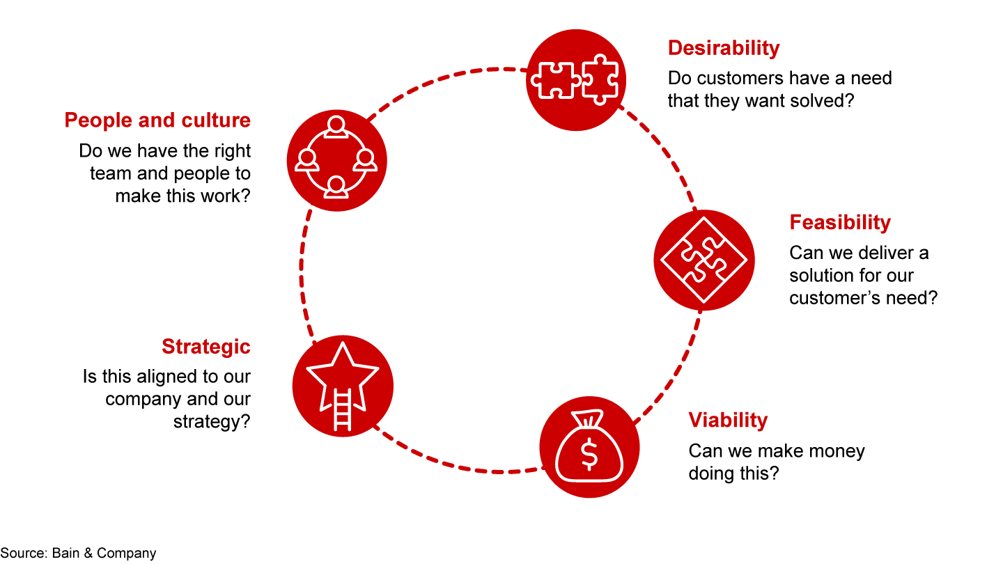 Generating sufficient ideas is the first challenge. Paring them down and then managing that portfolio is the next. Utley and Klebahn propose that managers apply three filters sequentially: first, what is desirable for the user; second, what is feasible technically; and finally, what is economically viable. To those, we would add two more tests: strategy (whether an idea aligns with the company’s long-term strategic plan) and people (who on the executive team will sponsor the idea and who will staff the teams) (see Figure 3).