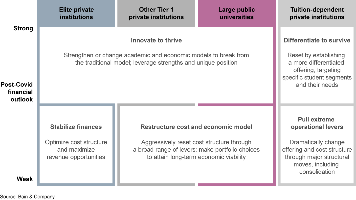 - But many schools have been on an unsustainable path for more than a decade. Bain’s modeling finds that heavily tuition-dependent private institutions face the greatest risk. Up to 60% of these schools have a weak financial outlook.