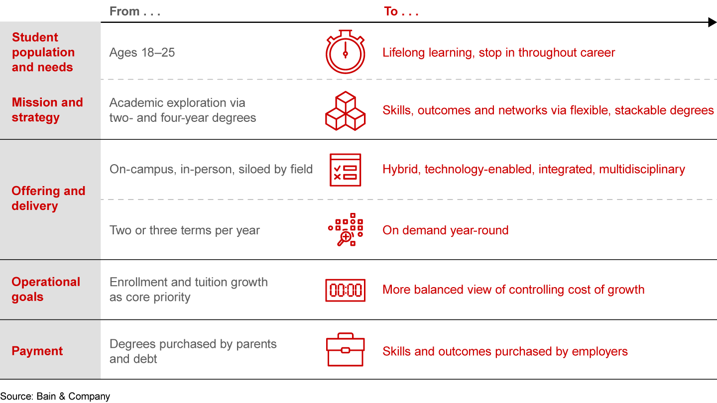 The standard higher education model has not changed much over the past half-century or so. Typically, an 18- to 22-year-old procures a two- or four-year degree paid for by parents or debt, with courses delivered on campus during two or three terms per year. Recently, though, demand has splintered into different segments of students. Many want programs of study and job placement that align closely with their career goals, with continuous learning throughout their lives. The digital revolution has both enabled lifelong education and stoked the need for it. New learning models, instructional opportunities and degree offerings have sprung up.