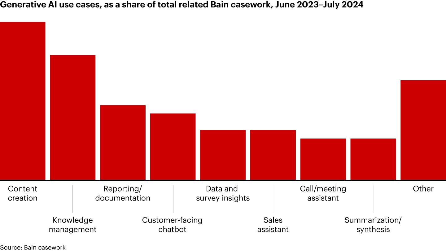 Content creation, knowledge management, and reporting and documentation are among the most common applications of generative AI