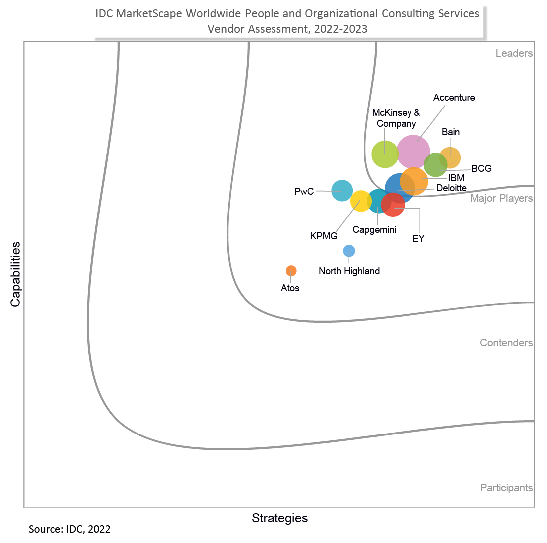 According to the IDC MarketScape, “Based on client feedback and IDC analysts' evaluation, Bain is seen to excel at leveraging a range of "assets" to accelerate delivery and improve consistency of consulting services, be able to help clients implement recommended consulting approach and ensure adoption by the client, and establish capabilities related to components of organizational change centered on how people are organized, managed, and engaged.”